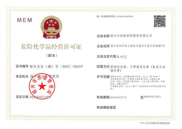 紹興興欣新材料股份有限公司成立于2002年06月27日,占地面積122畝,位于杭州灣上虞經(jīng)濟(jì)技術(shù)開發(fā)區(qū)拓展路2號(hào),現(xiàn)有職工200余人,專業(yè)技術(shù)人員50余人;博士、碩士研究生30余人組成的一支知識(shí)型、專業(yè)化的技術(shù)科研團(tuán)隊(duì)。公司面向全球市場(chǎng),專業(yè)開發(fā)電子化學(xué)品、環(huán)保化學(xué)品、醫(yī)藥中間體、高分子材料等先進(jìn)新材料重點(diǎn)領(lǐng)域的省級(jí)科技型企業(yè);建有浙江上虞、安徽東至兩個(gè)生產(chǎn)基地。目前為“國家高新技術(shù)企業(yè)”、浙江省“隱形冠軍”企業(yè)、浙江省專精特新中小企業(yè);建有“省級(jí)”研究開發(fā)中心,共建天津大學(xué)浙江紹興研究院電子化學(xué)品研發(fā)中心。